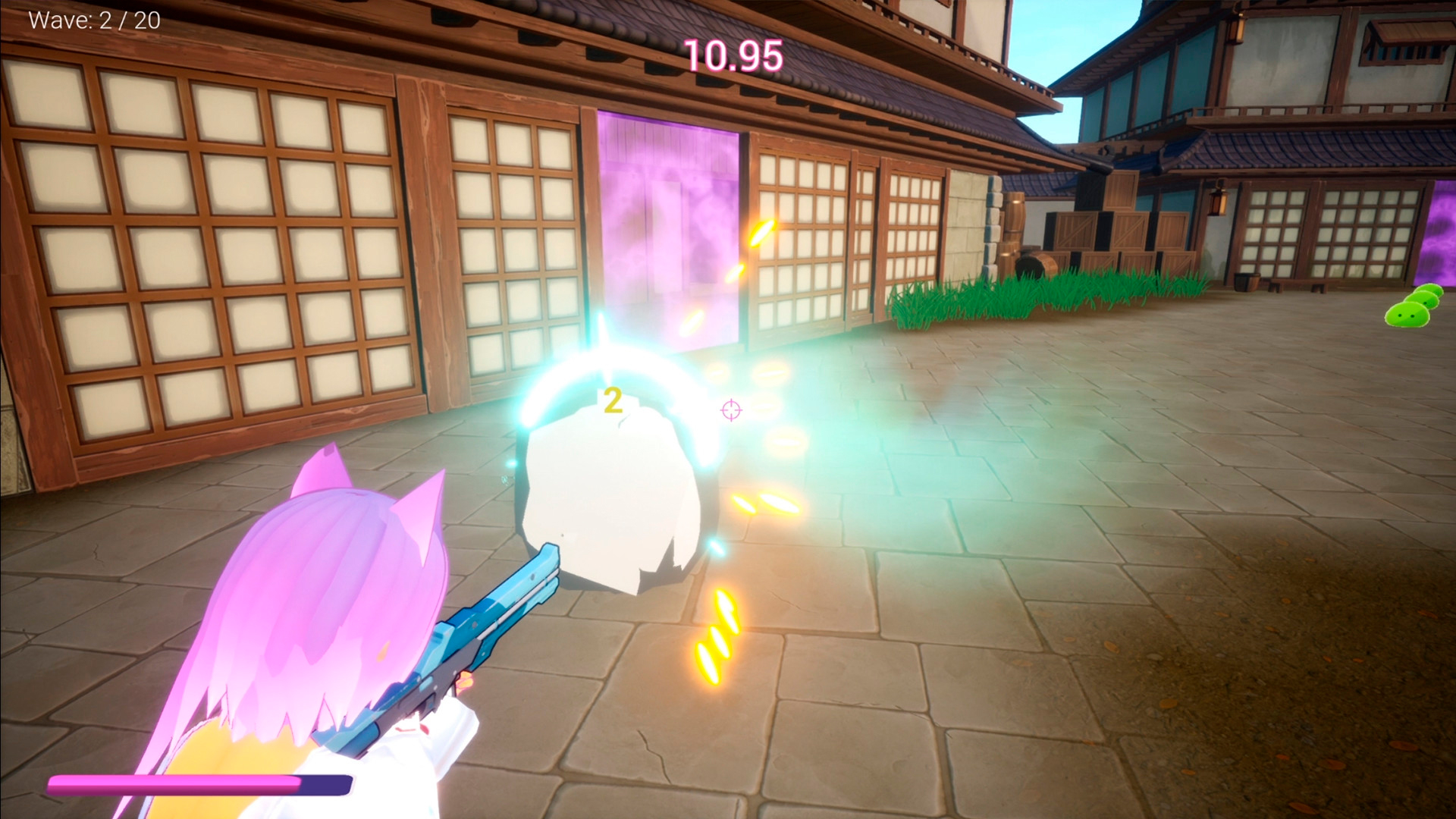 There are a variety of portal doors that slimes come out from. You are timed to take out the batch before additional waves of slimes come out. Taking them out quickly helps gain bonuses quicker such as increased health or enabling quicker shots. Otherwise, more slimes will enter the field, making it more challenging for the player to navigate. Players can maneuver in the area, but the field to roam around isn’t big. You’ll have to be tactical to take out all the slimes.