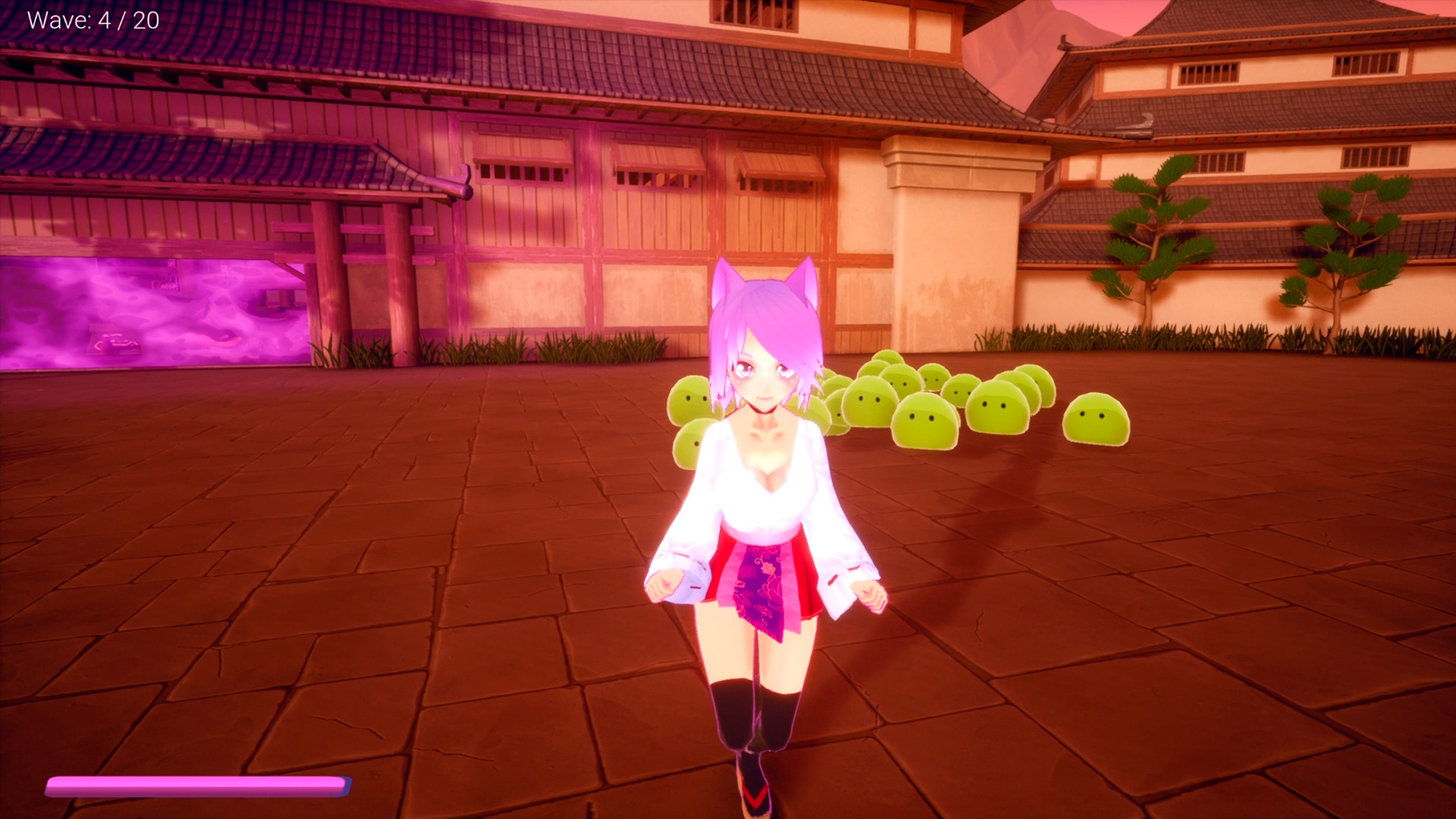 You will play as Yui, a female anime-style character with cat ears. Your goal is to defeat a horde of bouncing slimes that are trying to deplete your health to zero. Compared to many other shooter-style games, this one is unique with its cuteness.