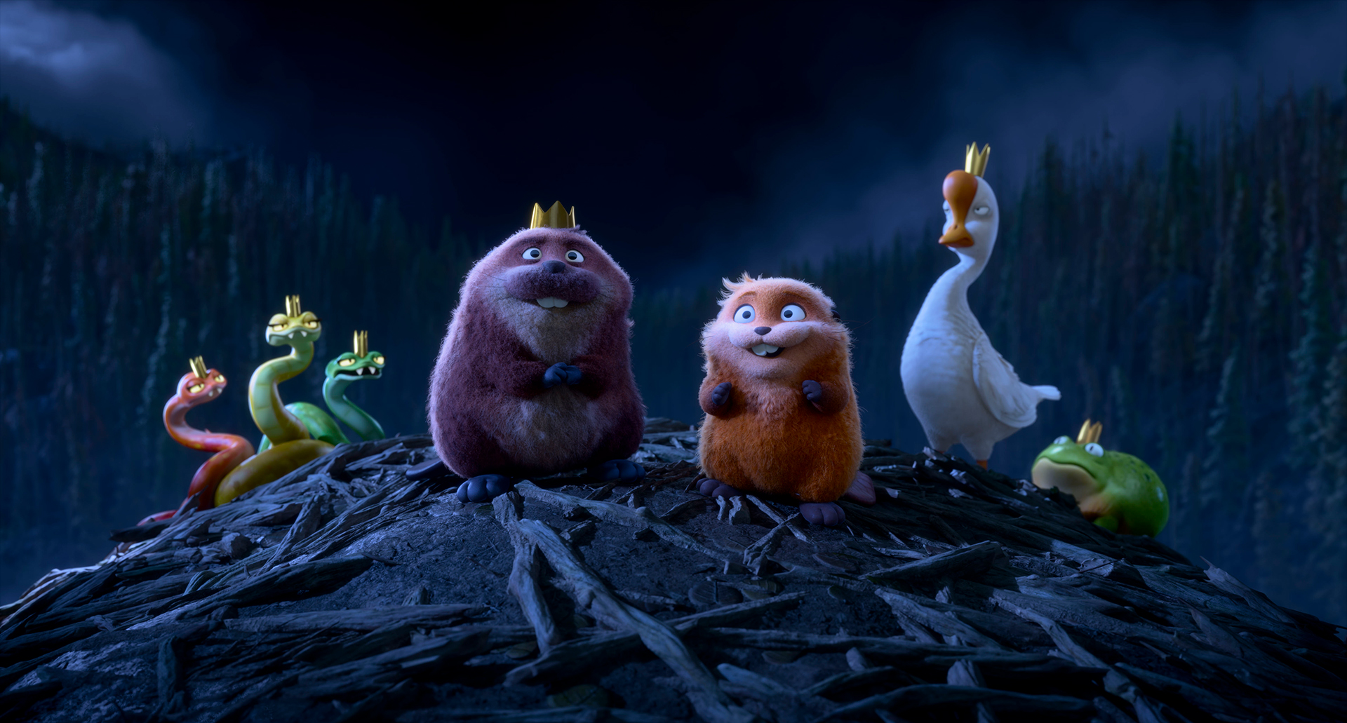 From there, her world turns upside down into a chaotic journey through the animal kingdom. Watching her reactions as she navigates her situation within the community of nature brings serious moments and big laughs. Mabel’s first confrontation with King George, voiced by Bobby Moynihan (Inside Out 2, IF), the beaver who rules the area, brings unexpected moments, both comical and emotional. The relationship building between these two carries heartbreaking and heartwarming moments, making King George a pivotal supporting character. Other characters such as the bear, another beaver who was originally to be eaten by the bear from this group, and the lizard bring a strong supporting cast during Mabel’s journey. Also, there’s Pond Rules, a set of rules that stay on course with nature, which gives a moment of real-life such as being eaten but with a comical topping to it.